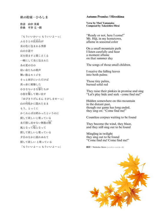 【楽譜】『秋の約束 ー ひろしま』(山中茉莉 作詩/平井丈一朗 作曲)★広島から世界へ~平和の祈りを込めて~